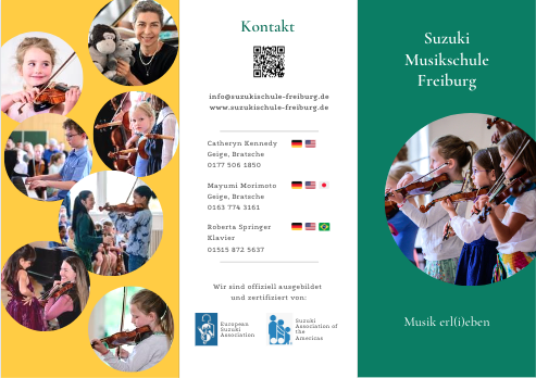Im Jahr 2020 wurde die Suzuki Musikschule Freiburg von Mayumi Morimoto, Catheryn Kennedy und mir gegründet. Obwohl die Schule derzeit noch kein gemeinsames Hauptquartier hat, arbeiten wir zusammen, um Konzerte, Gruppenunterricht, Workshops für Eltern und Unterrichtsmaterialien zu fördern und unterstützen uns gegenseitig in allen Aspekten der Musikerziehung. Seit 2022 bilden wir ein Trio aus Geige, Bratsche und Klavier.
